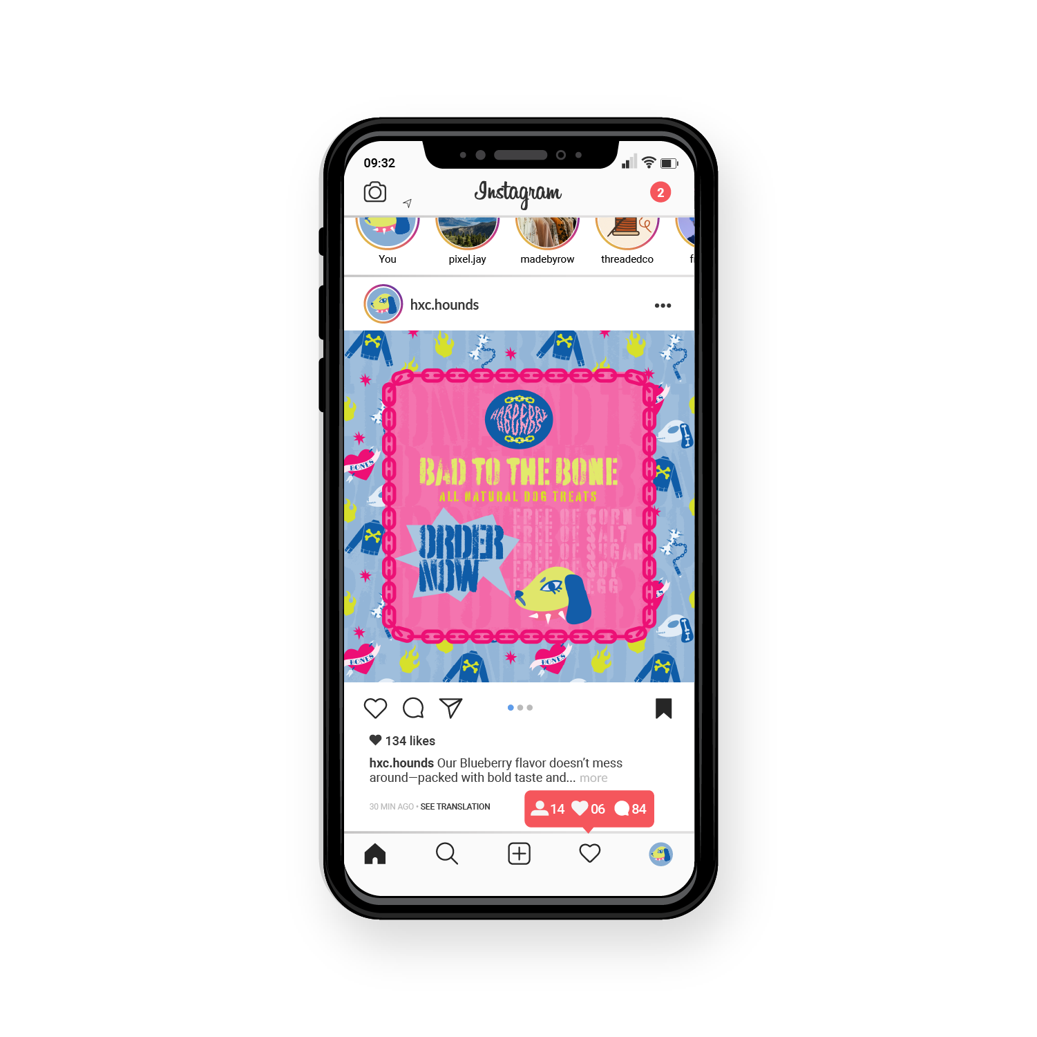 I extended the Hardcore Hounds brand into digital marketing by designing an Instagram post and web banner ads. The playful illustrations and bold three-color palette were adapted to create engaging, on-brand touchpoints that bring the product’s energetic personality to life online.