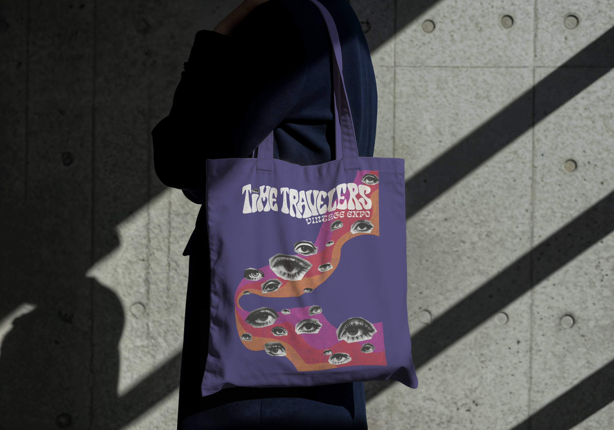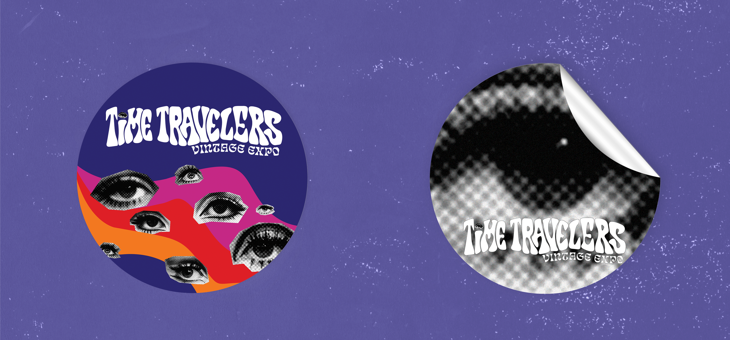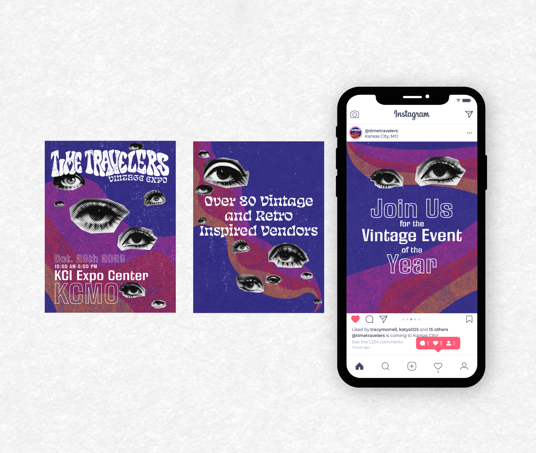I developed a cohesive visual identity for the Time Travelers Vintage Expo in Kansas City, including a poster, social media graphics, and event merchandise. The visuals draw inspiration from vintage design and feature vintage photos of eyes with iconic 1960s mod makeup. The overall aesthetic is playful, nostalgic, and fun—capturing the spirit of the event while giving it a visually striking, retro identity.